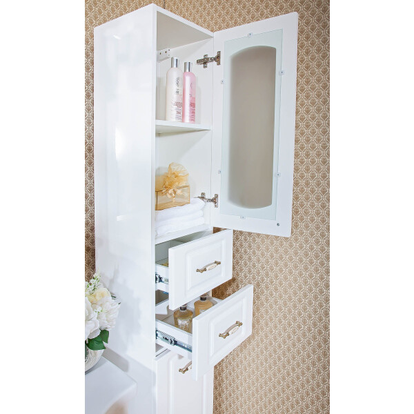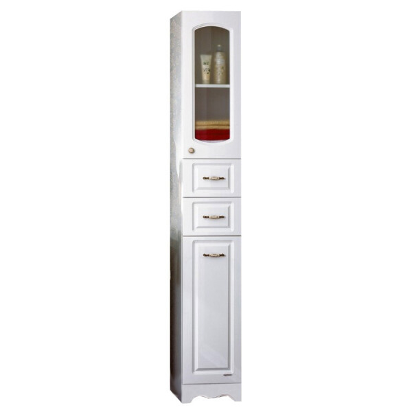 Изяществу этой модели может позавидовать мебель европейской сборки. Очаровательный пенал «Анна» (белый глянец) особенно придется по вкусу натурам романтичным: светлые фасады, золотисто-фарфоровая фурнитура (ручки), рельефный фасад – прелести чистейший образец, исполненный в неоклассическом стиле. Помимо внешней красоты, пенал «Анна» (белый глянец) функционален и практичен: за распашной дверкой есть вместительное отделение с полочкой, два выдвижных ящика спрячут от посторонних глаз мелкие аксессуары для ванной комнаты, а в нижнем блоке вы сможете хранить одежду для стирки. За счет увеличения ширины в пенале удалось разместить дополнительную боковую секцию с распашной дверцей, где пространство поделено горизонтальной полкой.