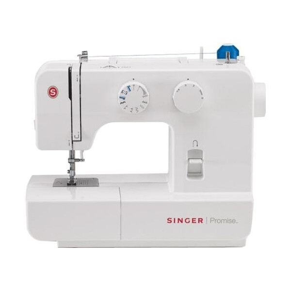 Швейная машина Singer Promise 1409 электромеханического типа привлекает внимание компактными габаритами и белоснежным дизайном. Предусматривается наличие качающегося челнока, 8 швейных операций и полуавтоматического типа вдевания петли. Лапка может подниматься на высоту до 1 см. Стежки осуществляются с максимальной длиной 4 мм и шириной 5 мм. Швейная машина позволяет шить двойной иглой, а также эластичной и потайной строчкой. Имеются рукавная платформа и отсек для удобного хранения аксессуаров. Модель Singer Promise 1409 дополнена лапками для пришивания пуговиц и вшивания молнии. Машинка весит 6.5 кг, действует с потребляемой мощностью 85 Вт и поставляется с мягким чехлом в комплектации со всеми необходимыми аксессуарами.