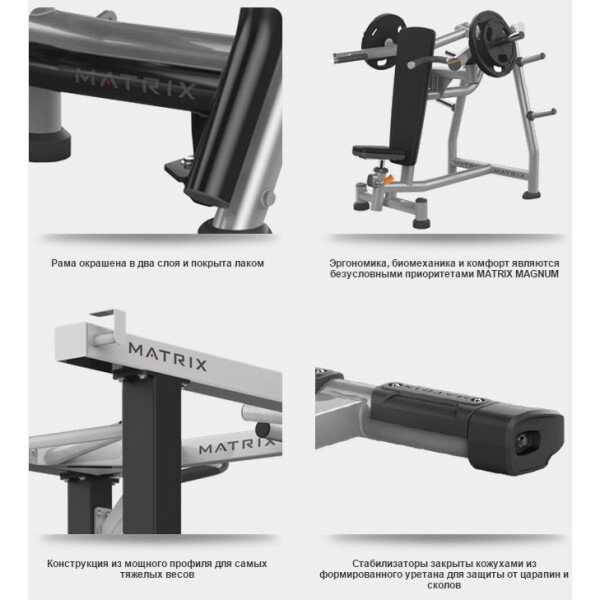 MATRIX MAGNUM A45 - ультрапрофессиональная cиловая станция для жима от плеч. Конструкция из мощного профиля выдерживает работу с самыми тяжелыми весами. Рама окрашена в два слоя и покрыта лаком. Держатели для штанги на боковых стойках выполнены из формированного уретана.