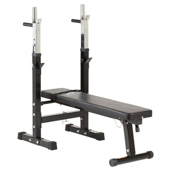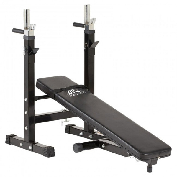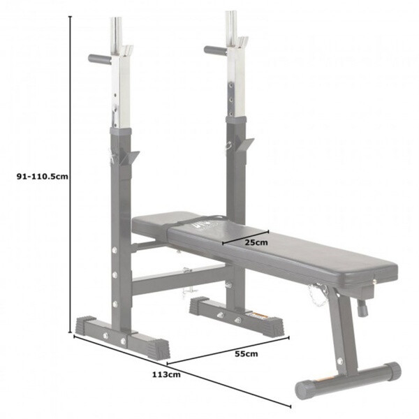 Скамья силовая со стойками под штангу. Предназначена для выполнения различных упражнений: жим штанги лежа, отжимания на брусьях и другие. Стойки тренажера регулируются по высоте в 5 положениях в диапазоне от 79 до 99 см. Две рукоятки с обратной стороны стоек предназначены для отжиманий. Складная конструкция позволит сложить скамью после занятий.