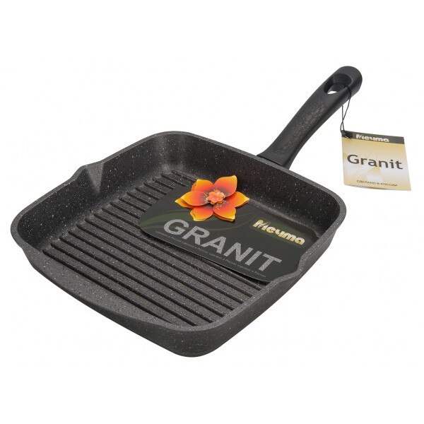 Сковорода-гриль Гранит квадратной формы произведена компанией Мечта из толстостенного литого алюминия. Корпус выполнен в черном цвете с небольшими вкраплениями. Эргономичная ручка изготовлена из бакелита — термостойкая пластмасса не нагревается и не скользит.