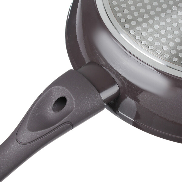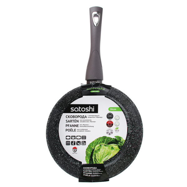 Сковорода SATOSHI Стенвиль диаметром 26 см изготовлена из высококачественного литого алюминия с антипригарным покрытием и рифленой поверхностью. Все это способствует быстрому и равномерному нагреву. Пища не прилипает к стенкам посуды, на ней можно готовить с минимальным добавлением масла и жиров.