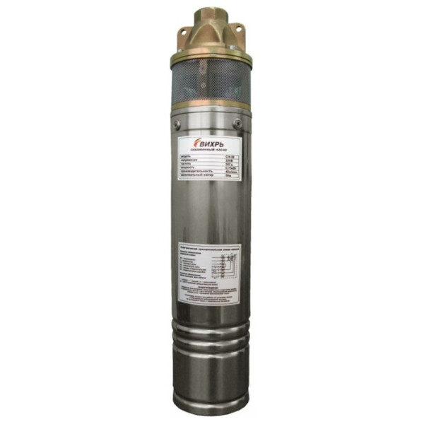Скважинный насос Вихрь СН-50Н (с нижним забором воды) предназначен для подачи незагрязненной воды из скважин диаметром не менее 100 мм. Высота подъема достигает 50 м. Корпус насоса выполнен из нержавеющей стали. В конструкции агрегата предусмотрено термореле для защиты двигателя от перегрева. Материал насосной части - пластик.