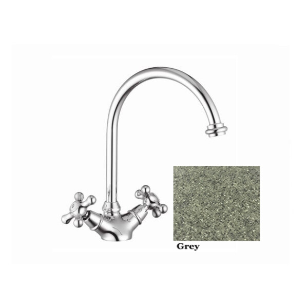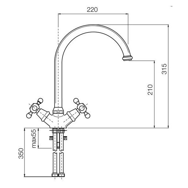 Двухвентельный кухонный смеситель ITALMIX Novecento 0900. Прекрасно подходит к мойкам классического стиля средних и больших размеров. Угол поворота крана 90°. Легкое подключение гибким шлангом с гайкой на 3/8, штуцер-10 мм, длинной 350 мм. Крепёж при максимальной толщине столешницы - 60 мм.