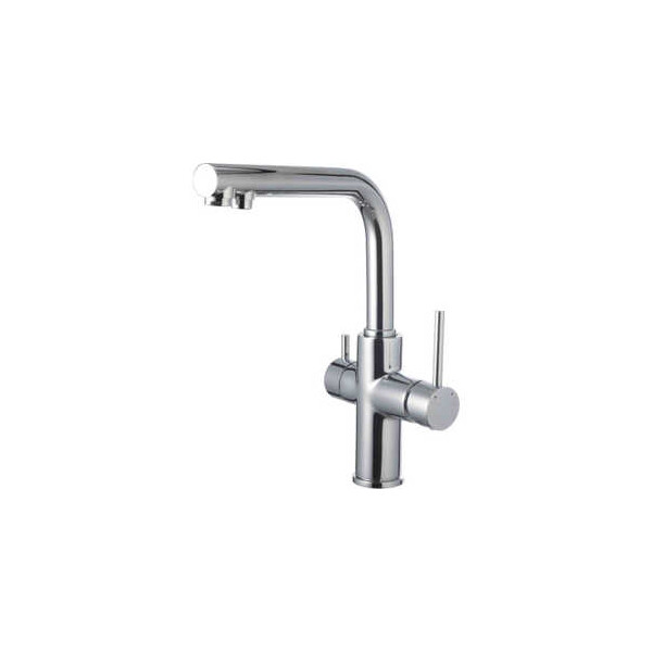 Надежную работу оборудования обеспечивают рабочие механизмы: для водопроводной воды предназначен керамический картридж 35 мм, для питьевой – кран-букса с керамическими пластинами (угол поворота 90°). Управление смесителем происходит с помощью двух металлических рукояток: малая – для фильтра, большая – для водопроводной воды.