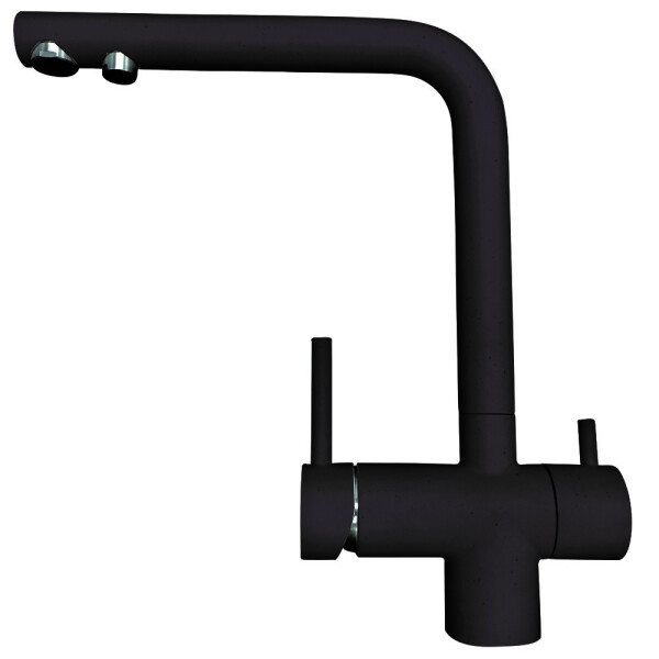 Модель изготовлена из латуни. Имеется подключение к фильтру очистки воды. Обычно для водяного фильтра на раковину устанавливается отдельный излив, что требует дополнительного места. Смеситель с подключением к фильтру является альтернативой он имеет два отдельных входных отверстия под водопровод и фильтр, а также отдельный рычажок для подачи фильтрованной воды. Это позволяет обойтись без отдельного крана для питьевой воды.