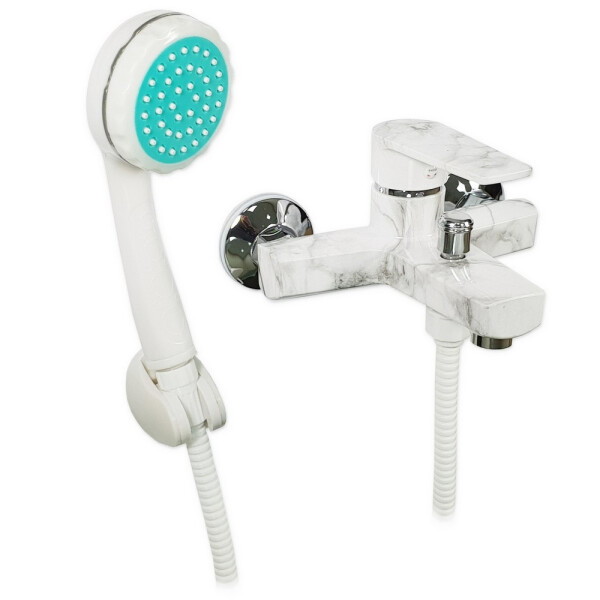 Смеситель для ванны Brimix 586 из высокопрочного пластика АБС. Цвет: белый мрамор. В комплекте шланг, лейка, кронштейн из белого плоастика. Чашки хром.