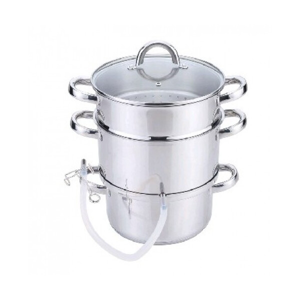 Дно капсулированное 5 слойное. - толщина стенок 0,6 мм - ручки стальные - крышка из закаленного стекла с пароотводом - в комлекте шланг со специальным зажимом, для удобного розлива готового сока (позвляет приостановить подачу сока, во время смены тары) - упаковка: цветная картонная коробка - объем 6 л. - Подходит для всех типов плит (включая индукционные).