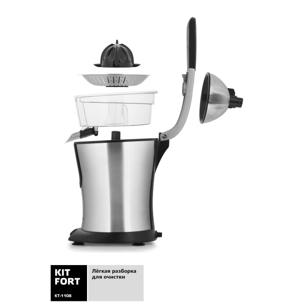 Соковыжималка KITFORT КТ-1108 станет прекрасным украшением и что самое главное — поможет приготовить вкусный сок. Данная модель отличается мощным мотором и высокой скоростью, поэтому на приготовление сока уйдет пара мгновений. Прорезиненные ножки повышают устойчивость прибора на столе и уменьшают вибрацию. Также предусмотрен резервуар для сбора готового сока. Представленная модель с прижимным механизмом предназначена для отжима сока из цитрусовых плодов малого и среднего размера. Корпус устройства, фильтр и носик выполнены из нержавеющей стали, остальные детали изготовлены из качественного пищевого пластика. Чтобы привести соковыжималку в действие нужно нажать на ручку. Ручка покрыта специальным, мягким на ощупь пластиком. Подача сока осуществляется сразу в ваш бокал.