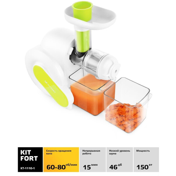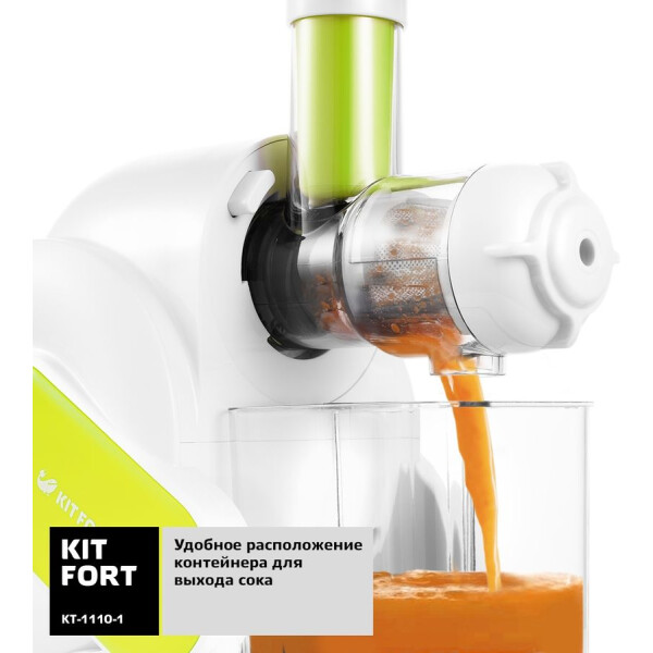 Шнековая соковыжималка Kitfort KT-1110 позволяет отжимать максимально возможное количество сока из фруктов, овощей и зелени с сохранением всех его полезных компонентов: витаминов, аминокислот и минералов. Сок во время отжима не нагревается и не окисляется. Соковыжималка легко собирается и просто моется после работы.