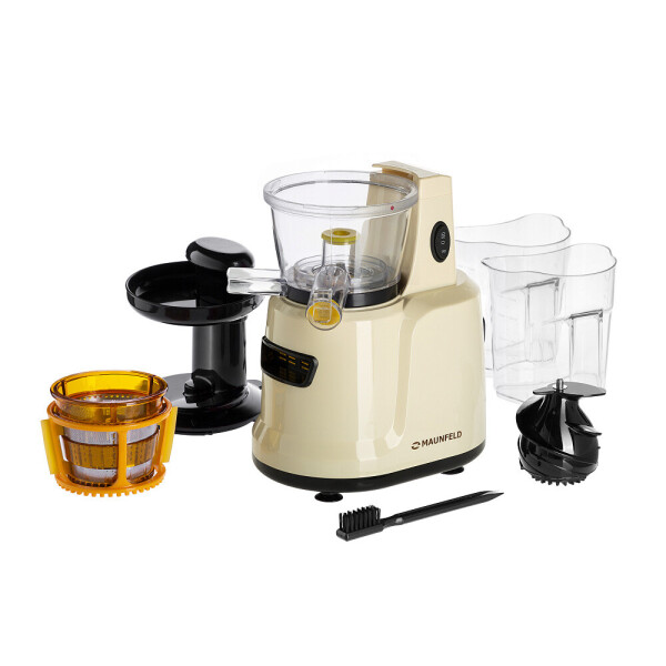 Комплектация соковыжималки Maunfeld MF-931BG: толкатель, загрузочный лоток 0,8л, контейнер для сока 0,8л, вращающийся шнек, фильтр, щетка.