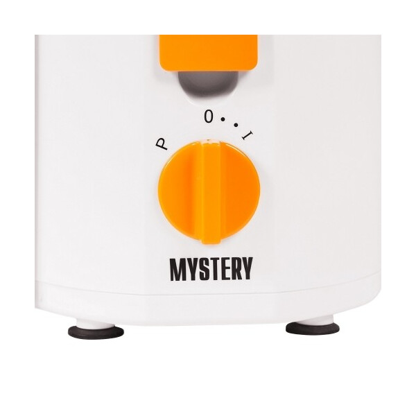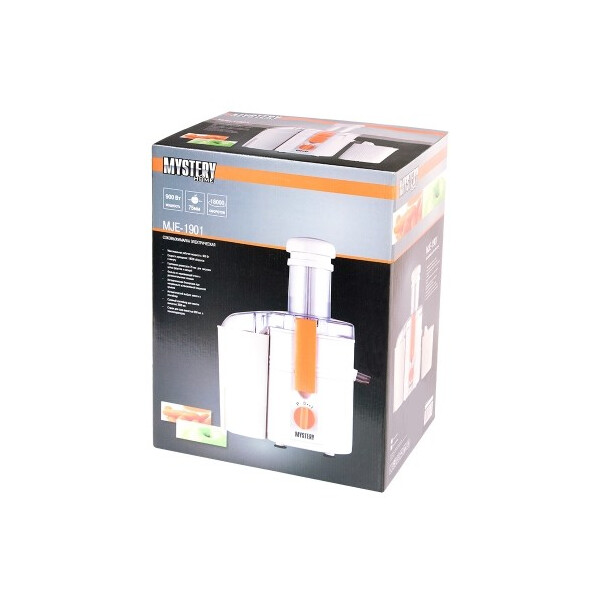 Устройство центробежного типа. За счет вращения на высокой скорости происходит отжим сока из мякоти. Mystery MJE-1901 обладает мощностью 900 Вт. Вас порадует высокая производительность, можно быстро перерабатывать сырье.
