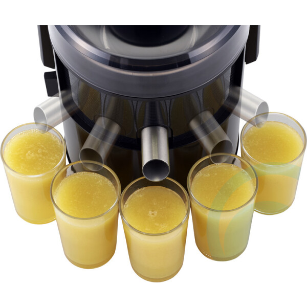 Процесс отжима происходит с помощью центрифуги. Высокая скорость вращения развивается 800 Вт мотором. Вращающиеся ножи тщательно измельчают плоды, а законы физики прижимают их к фильтру и выдавливают соки. Мякоть автоматически попадает в соответствующий отсек, а свежевыжатый сок стекает в емкость на 1500 мл.