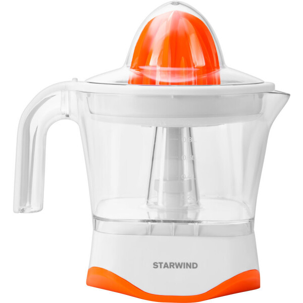 Соковыжималка Starwind SJ 1231 это отличный вариант кухонной утвари, который обязательно должен присутствовать у вас дома. Таким изделием актуально пользоваться тем людям, которые предпочитают вести здоровый образ жизни. Буквально за пару движений сок из цитрусовых будет готов. Мощность соковыжималки составляет порядка 30 Ватт, а объем предусмотренной прозрачной емкости равен одному литру. Изготавливается такая модель на основе прочного пластика, выполнена в привлекательном дизайне. Соотношение оранжевого и белого цветов сразу привлекает внимание пришедших к вам гостей.