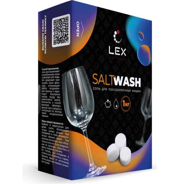 Соль для посудомоечных машин Lex SALTWASH эффективно и естественно оптимизирует процесс мытья и сохранит первоначальный блеск посуды. Таблетированный продукт. В 2 раза экономичнее гранулированной соли.