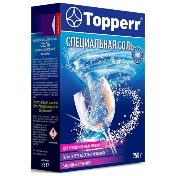 Крупнокристаллическая универсальная соль Topperr предназначена для защиты внутренних деталей посудомоечных машин от образования известкового налета и для оптимального функционирования ионообменника. Соль улучшает качество мойки и помогает эффективной работе Вашей посудомоечной машины.