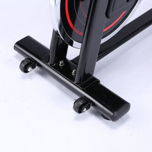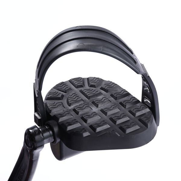 Фиксация ног в педалях с помощью резиновых ремней с регулировкой. Для перемещения тренажера в помещении установлены колеса.