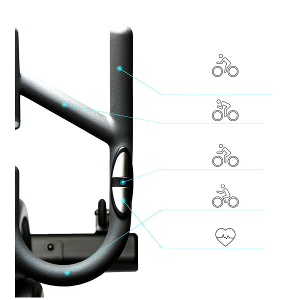 Особого внимания заслуживает конструкция руля спин-байка. Многопозиционный руль имеет несколько зон для опоры и позволяет выбрать нужный вариант при тренировке, в том числе для имитации езды на спортивном велосипеде. Кожух руля спин-байка изготовлен из материала нового поколения, адсорбирующего излишнюю влагу с ладоней и обладающего комфортной текстурой поверхности. Руль имеет удобную многоступенчатую регулировку по высоте с надёжным механизмом фиксации DUAL LOCKTM. Также, в руль встроен устойчивый держатель планшета под оптимальным углом обзора для пользователя.