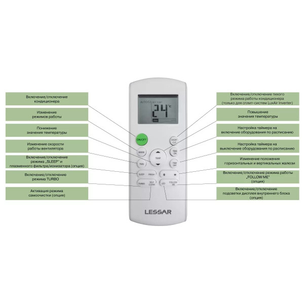 Lessar (Лессар) LS-HE12KSE2/LU-HE12KSE2 это сплит-система, отличающаяся надежностью и великолепным внешним видом. Данное устройство помимо основных режимов, обогрева и охлаждения, имеет также режим осушения и режим вентиляция. Для повышения качества воздуха в помещении кондиционер оснащен ионизатором.