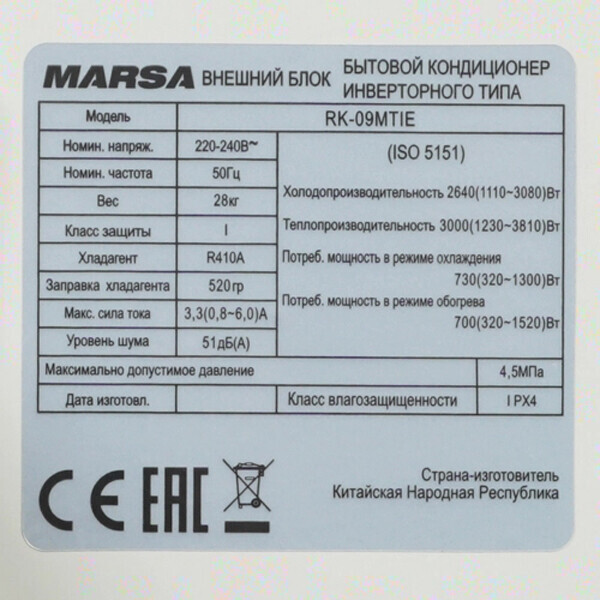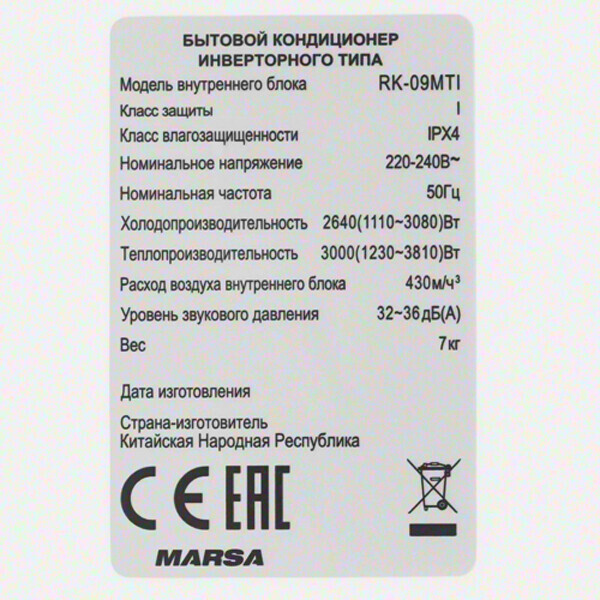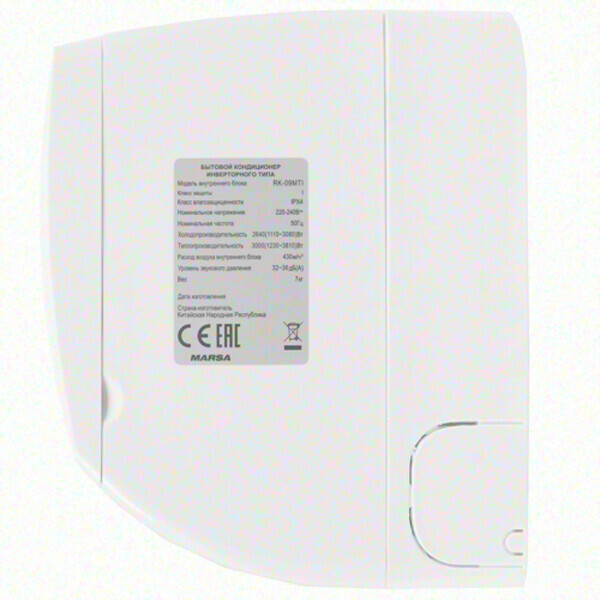 Marsa (Марса) RK-09MTI инверторная сплит-система современного поколения, разработанная для функционирования на площади помещений до 25 квадратных метров. Модель отличается стальным дизайном внутреннего блока с моющейся лицевой панелью. Кондиционер оснащен системой фильтрации воздуха, включающей в себя угольный фильтр от неприятных запахов и катехиновый фильтр от различных бактерий и вирусов. Сплит-система способна стабильно работать при температуре наружного воздуха до минус 7 градусов.