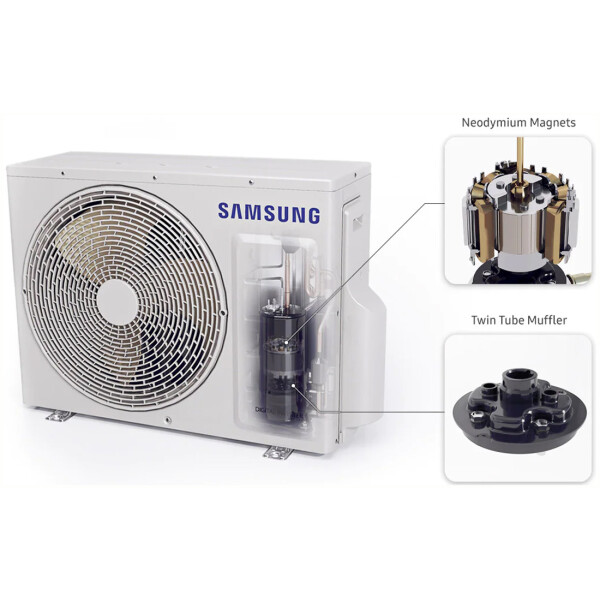 Сплит система Samsung AR18TQHQAURNER / AR18TQHQAURXER работает на безопасном фреоне R410A. На блоке расположен цифровой дисплей, где отображается текущий режим работы и температура.