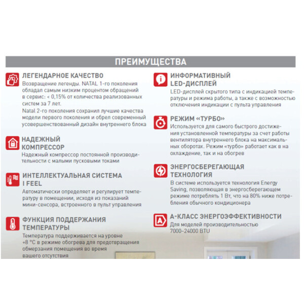 Информативный LED-дисплей скрытого типа с индикацией температуры и режима работы, а также с возможностью отключения индикации с пульта управления.