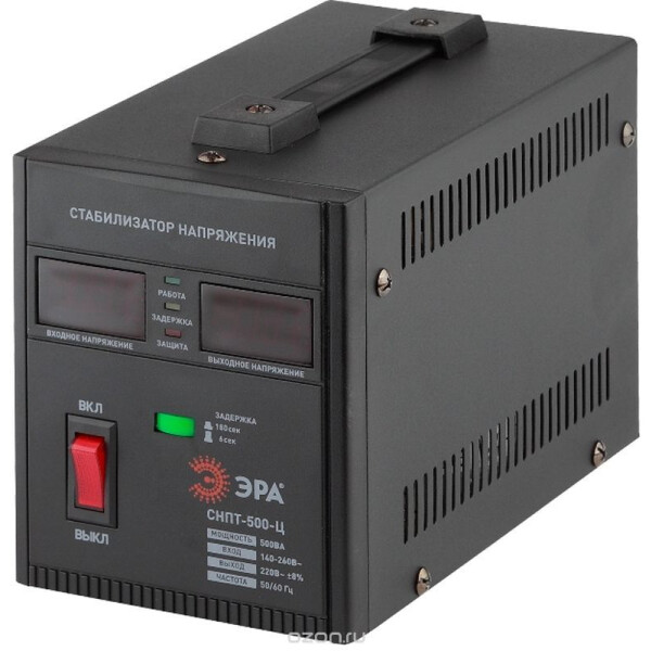 ЭРА СНПТ-500-Ц стабилизатор напряжения переносной с тороидальным трансформатором рассчитанный на нагрузку 0.5 кВт. Стабилизатор напряжения СНПТ-500-Ц защитит ваши электроприборы от скачков напряжения, от короткого замыкания и продлит их срок службы работы. Прибор имеет малый вес, имеет металлический корпус и оснащён удобной ручкой для переноса.