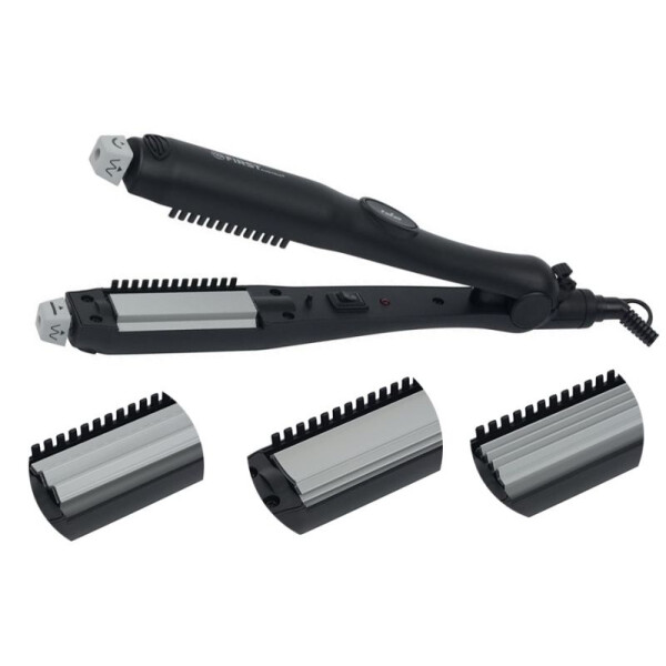 Щипцы для выпрямления волос "First FA-5670-3" оснащены 4 парами сменных пластин с керамическим покрытием. Щипцы имеют световой индикатор, выключатель питания, фиксатор для удобного хранения, а также петлю для подвешивания.