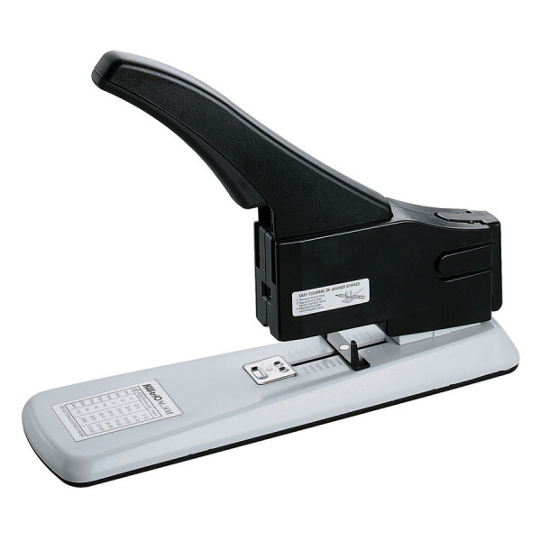 | Мощный степлер на 210 листов, глубина загрузки 70мм, металлический корпус с прорезиненной рукоятью. Нескользящее основание, регулировка глубины загрузки бумаги. |