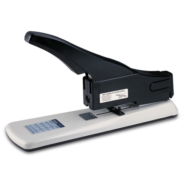Мощный степлер на 100 листов, глубина загрузки 65 мм, металлический корпус с прорезиненной рукоятью. Нескользящее основание, регулировка глубины загрузки бумаги.