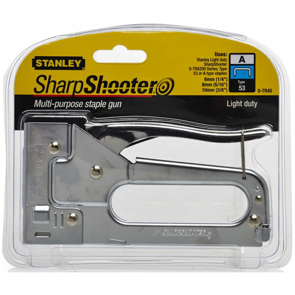 Степлер Stanley LIGHT DUTY TR45 для скоб типа А 6-8 мм 6-TR45 предназначен для сбора мебели, небольших деревянных конструкций, крепления строительной пленки. Прочный корпус из металла. Специальный фиксатор для рукоятки позволяет безопасно хранить инструмент. В качестве расходных материалов используются скобы типа А.