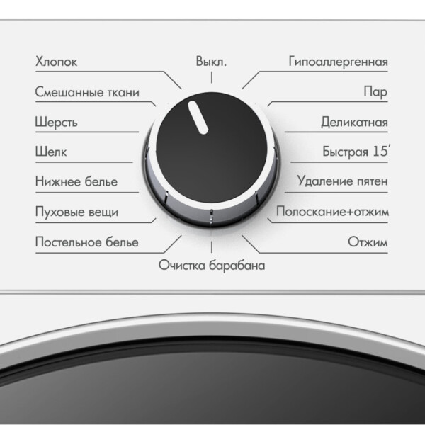 Есть 15 программ стирки (например, обработка паром, быстрая программа на 15 минут, пятновыведение или детский антиаллергенный режим), выбрать которые можно механическим поворотным регулятором. Информация о режиме, температуре, скорости отжима и времени работы отображается на дисплее.