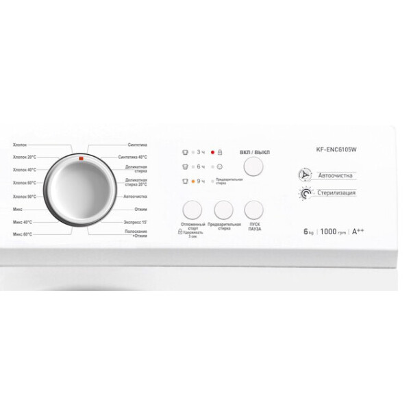 Стиральная машина KF-ENC6105Wс загрузкой белья до 6 кг оснащена 16 программами стирки, максимальная скорость отжима составляет 1000 оборотов в минуту. Модель обладает функциями дозагрузки белья и отложенного старта, системой защиты от перелива и блокировкой от детей, автоматическим перераспределением белья, контролем пенообразования и автоочисткой.