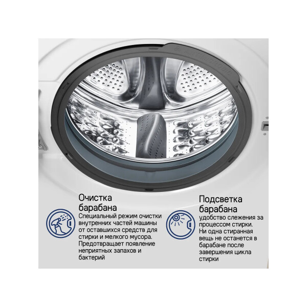 Автобалансировка загрузки равномерно распределяет белье внутри барабана и гарантирует низкий уровень шума при отжиме даже на самых высоких оборотах.