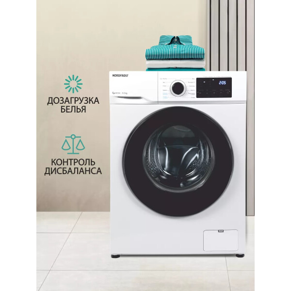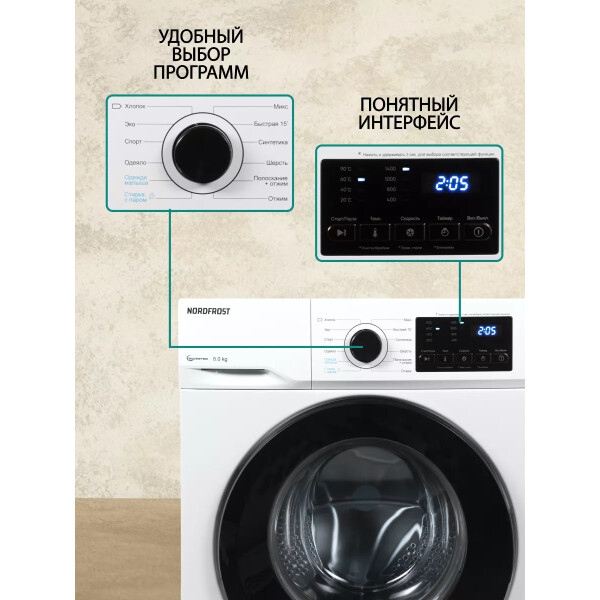 Кнопочный тип управления позволяет выбрать необходимую программу с предустановленными настройками, отрегулировать температуру и скорость отжима. На LED-дисплее световой индикацией отражается вся информация по режиму, старта/паузы, время окончания отложенной стирки, закрытого люка и неисправностей.