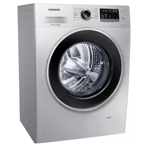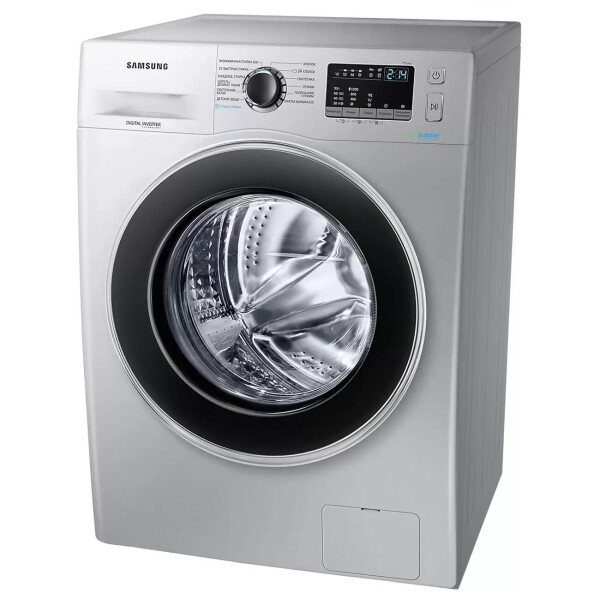 Узкая стиральная машина Samsung WW60J42E0HSOLD стильного серебристого цвета оборудована инверторным двигателем. За цикл стирки при максимальной загрузке 6 кг белья устройство расходует 36 л воды. Уровень шума при работе машины не превышает 52 дБ, что является довольно тихим показателем.