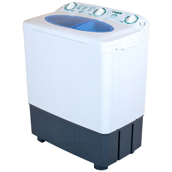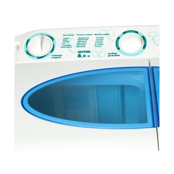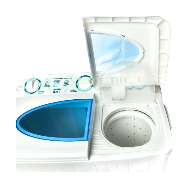 Вместительность основного отсека составляет 6 кг белья. Агрегат имеет две программы для стирки. Он прекрасно справится как с деликатными вещами, так и с неприхотливым бельем. По окончании процесса очищения прозвучит характерный сигнал, уведомляющий об этом. С помощью таймера можно выбрать время стирки. Использовать можно любой стиральный порошок, т.к. в машинах активаторного типа не образуется много пены. Один и тот же мыльный раствор можно применять для нескольких циклов стирки.