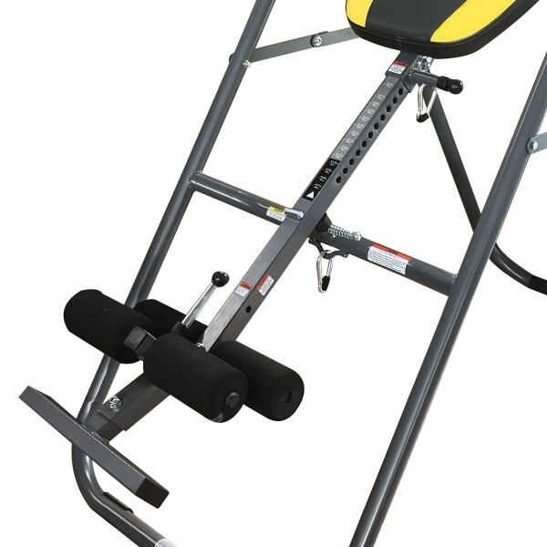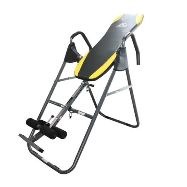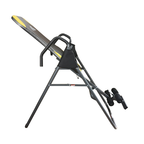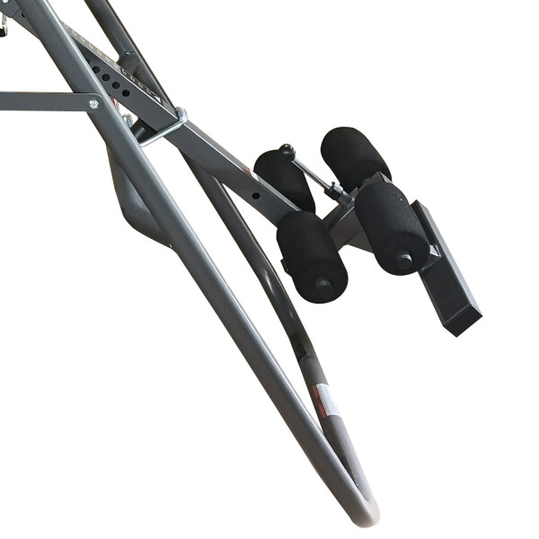Новая модель складного инверсионного стола с ограничением угла наклона с помощью ремешка. Для выбора нужного угла необходимо перед выполнением упражнений отклонить стол на требуемый угол, и выбрать лишнюю длину ремня с помощью пряжки. И далее приступать к занятиям. Стол возможно отклонить на любой угол. Складная конструкция модели позволит сложить стол после занятий и убрать на хранение. Удобные мягкие валики надежно фиксируют ноги во время виса вниз головой.