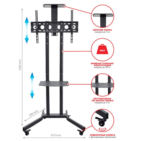 ARM MEDIA PT-STAND-9- мобильная стойка для всех типов современных телевизоров диагональю 32"-65" (81-165см). Идеально подходят как для небольших кабинетов или просторных офисов, чтобы проводить презентации, так и для дома.