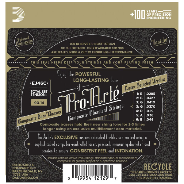 Струны D'Addario EJ46C выполняются на основе сердечника из эксклюзивного многоволоконного материала, обеспечивающего мощное, но теплое звучание с длительностью в 2-3 раза превышающей длительность звучания традиционных струн для классических инструментов.
