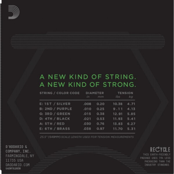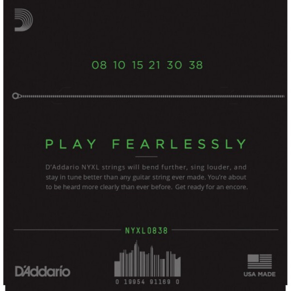 Струны D'Addario NYXL0838 созданы в Нью Йорке (США) на основе сплава эксклюзивной высокоуглеродистой стали для беспрецедентной прочности. Улучшенная стабильность строя по сравнению с традиционными струнами из никелированной стали - быстрее настраиваются и дольше держат строй. Струны с обмоткой имеют улучшенное звучание в среднечастотной области (1 - 3.5кГц) – увеличенный презенс и кранч хорошо прорезают микс. Безопасная для окружающей среды, устойчивая к возникновению коррозии упаковка для струн.