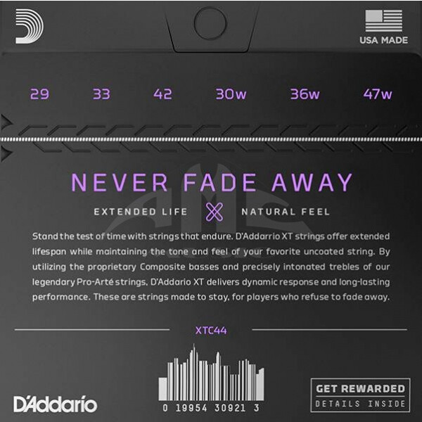 Струны D'Addario XTC44 обладают увеличенным сроком службы, повышенной прочностью, стабильностью строя, и при этом сохраняют характерные для струн без напыления ощущения и звучание. Исследования показали, что струны серии XT на 42% крепче и на 131% стабильнее обычных струн.