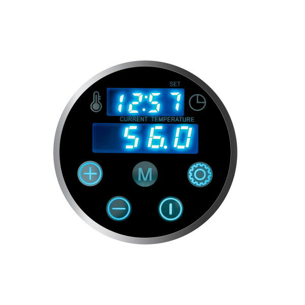 Нагревает 20 литров примерно за 45 мин. до 56 C.