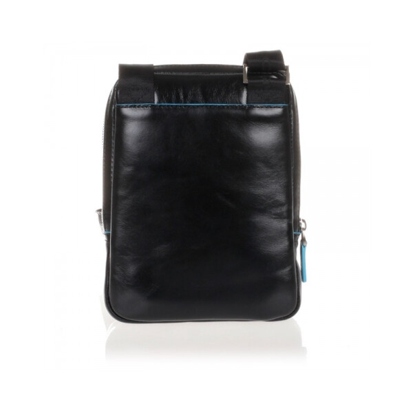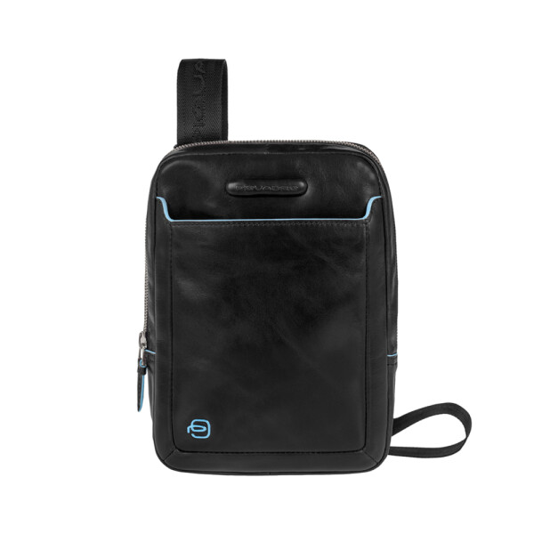 Кожаная сумка черного цвета с плечевым ремнем из коллекции Piquadro Blue Square. Имеет одно отделение, внутренний карман для iPad mini и внешний карман на молнии. Отличный вариант для переноски небольших вещей, таких, как паспорт, кошелек, водительские права и ключи.