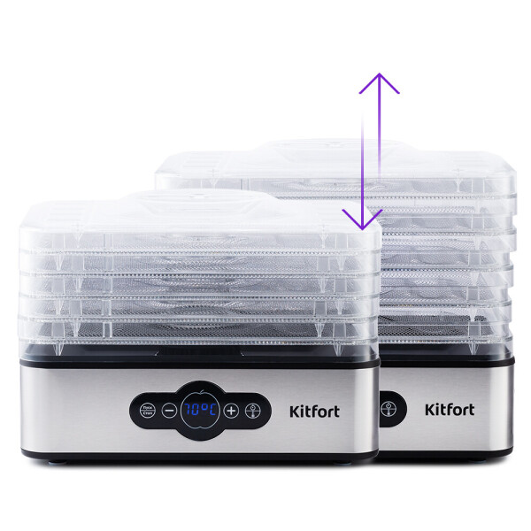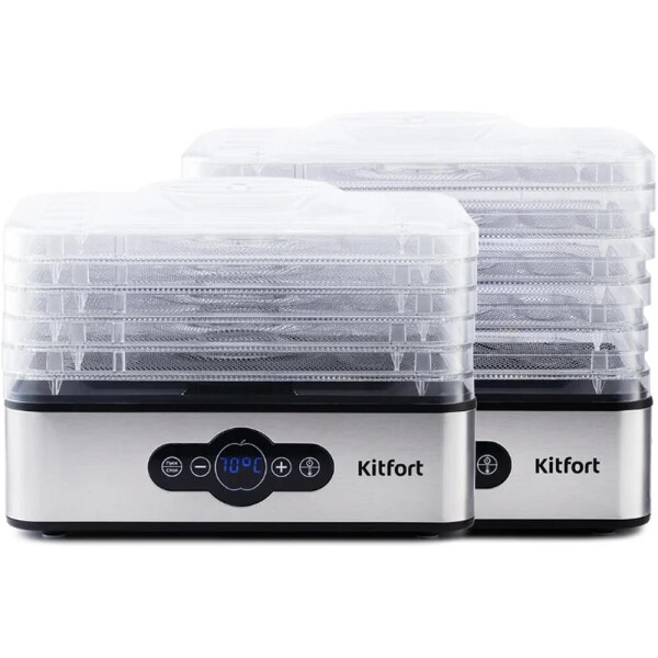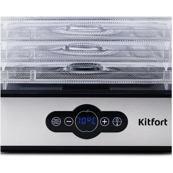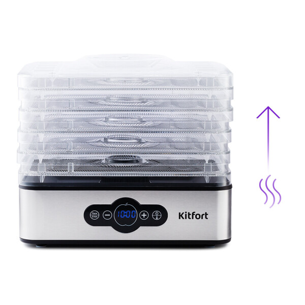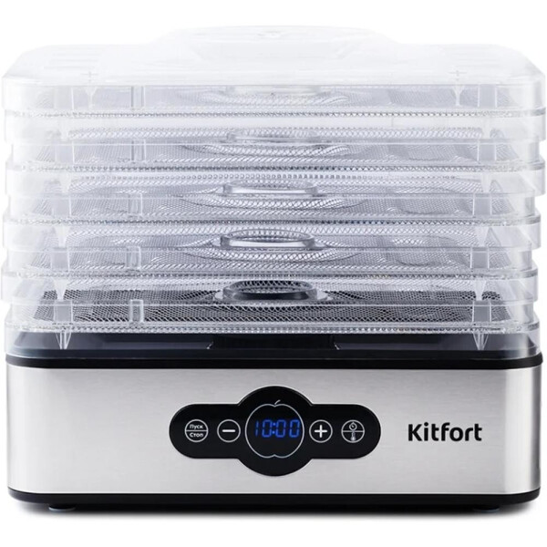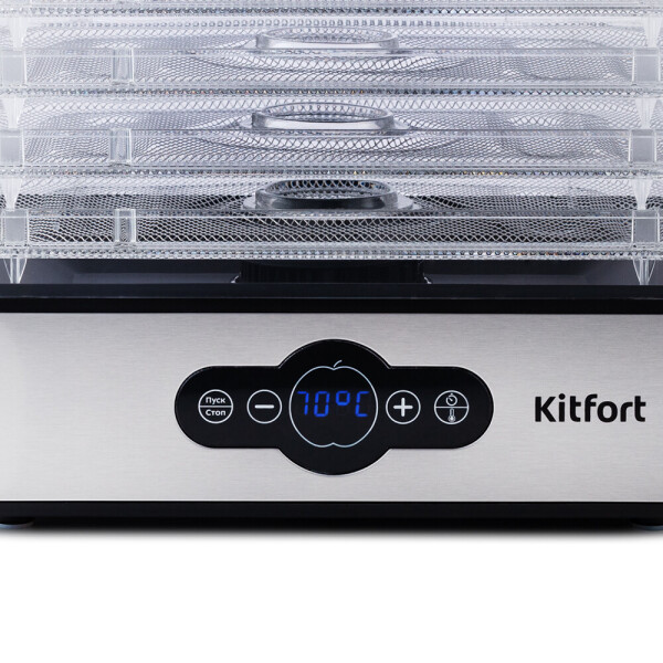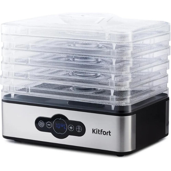 С электросушилкой Kitfort KT-1914 у вас под рукой будет всегда живая еда. Прибор насушит на зиму фрукты, овощи, ягоды, грибы, зелень, а также мясо, рыбу, пастилу и многое другое. Это не только вкусно, но и полезно! Благодаря компактному корпусу и оптимальному количеству поддонов сушилка для овощей и фруктов не займёт много места у вас на кухне.На передней панели устройства есть регулятор, с помощью которого вы можете установить температуру в диапазоне 35-70 C с шагом в 5 градусов, а также таймер до 99 часов с шагом в 30 минут. Сушилка имеет в комплекте 5 вместительных поддонов с сеткой из нержавеющей стали и прозрачными стенками, поэтому вы легко сможете наблюдать за процессом сушки.