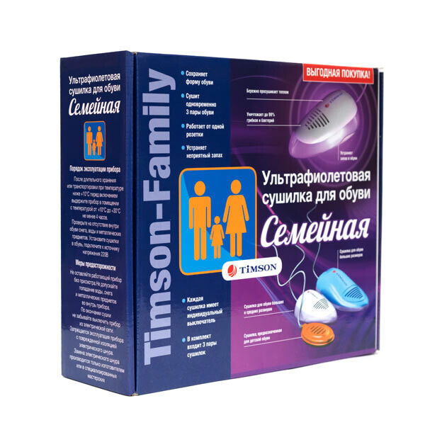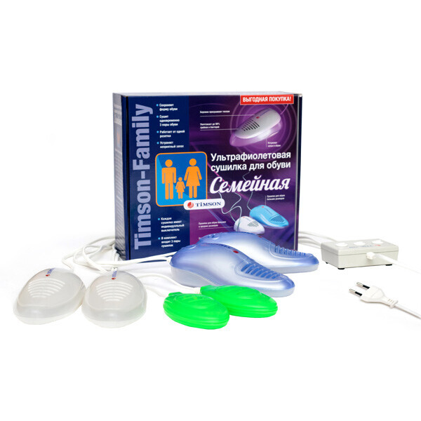 Электрическая сушилка для обуви Timson 2432 подойдет для семейного использования. Устройство способно сушить 3 пары обуви одновременно: пары большого и среднего размера, а также пару детской обуви. При сушке обувь не только согревается, но и теряет до 99% грибков и бактерий, находящихся внутри. Также происходит и устранение неприятных запахов. В процессе сушки сохраняется форма обуви.