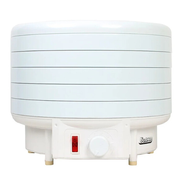 Электросушилка БелОМО 8360 является уникальными по своим характеристикам. В ней можно сушить любой продукт любой влажности, и сушеный продукт сохраняет свои первоначальные качества. Аппарат электробезопасен и отличается высокой работоспособностью. К тому же он экономичен в электропотреблении. В конструкции электросушилки БелОМО 8360 использованы безопасные высококачественные материалы. Уникальность электросушилки БелОМО состоит в том, что процесс сушки продуктов осуществляется максимально быстро и эффективно, благодаря системе направленного потока теплого воздуха. Двигатель с вентилятором создает поток воздуха, который нагреваясь, поступает равномерно на поддоны с продуктами. Теплый воздух подается вентилятором в простенок поддона (поддоны имеют двойную стенку), а затем оттуда горизонтально на каждый поддон. Постоянно поступающий поток теплого сухого воздуха выталкивает старый, который вобрал в себя влагу с продуктов. Такая схема движения воздуха позволяет обеспечить наиболее эффективную сушку продуктов. При достижении заданной температуры электронагреватель автоматически отключается. При снижении температуры ниже заданной электронагреватель автоматически включается. Электронагреватель включается, если установленная температура сушки выше температуры окружающего воздуха. Терморегулятор служит для плавного регулирования температуры сушки продуктов и имеет три основные температурные зоны: 1 и 2 зоны рекомендуются для сушки трав, 3 – для сушки фруктов, ягод, овощей и грибов.