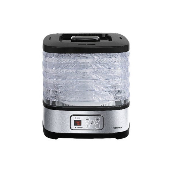 Сушилка для овощей и фруктов CENTEK Ct-1650 представлена в пластиковом черном корпусе с элементами из нержавеющей стали с прозрачными пятью секциями для удобного контроля рабочего процесса.