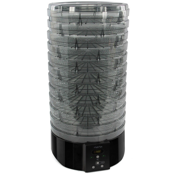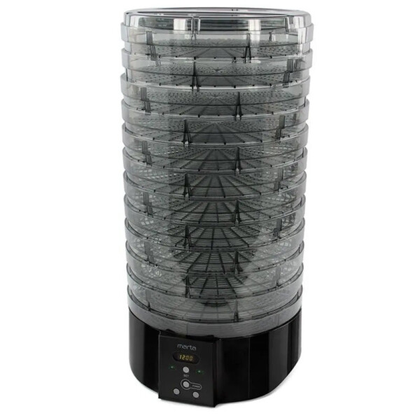Двенадцатиуровневая электросушилка c электронным контролем температуры для равномерной сушки трав, ягод, зелени, овощей, фруктов, орехов, грибов, приготовления вяленого мяса, птицы, рыбы, кисломолочных продуктов, а также растопки теста. Поддоны сушилки изготовлены из пищевого термостойкого пластика, устойчивого к высоким температурам, не выделяющего вредных веществ и посторонних запахов, сохраняющего вкус и аромат продуктов натуральными. Модель MT-FD1886A также укомплектована 3 поддонами для сушки ягод и 3 поддонами для приготовления пастилы. Многоярусная конструкция электросушилки позволяет разместить в небольшом объеме максимум продуктов и добиться их наилучшего распределения для быстрого и равномерного высушивания.