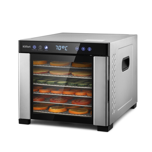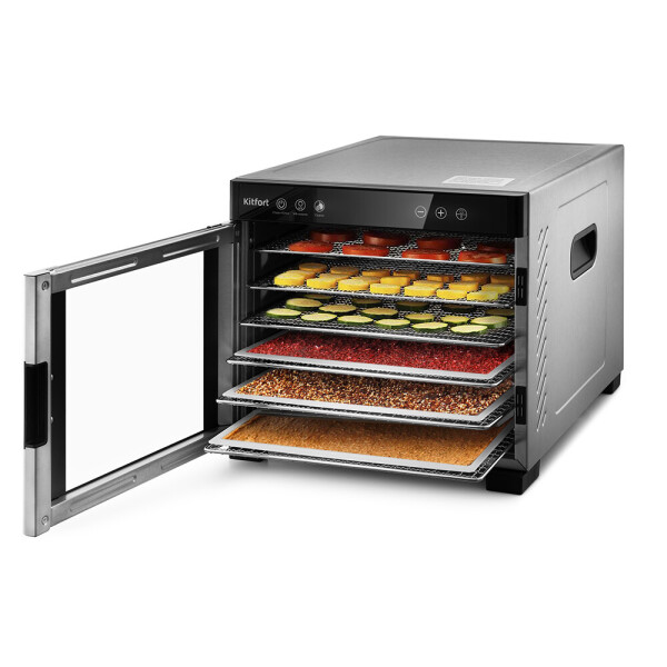 Вместительная электрическая сушилка Kitfort КТ-1916 предназначена для сушки овощей, фруктов, ягод, грибов, корнеплодов, трав и зелени, а также мяса и рыбы, хлеба. С помощью специальных сплошных поддонов можно готовить пастилу.